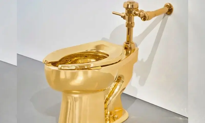 ایک مکمل طور پر فنکشنل سونے کے بیت الخلا کو متنازع اطالوی آرٹسٹ موریتزیو کیٹیلان نے تخلیق کیا، جس نے پہلے بھی کیلے کو ٹیپ سے دیوار سے لگا کر ایک آرٹ ورک بنایا اور اسے لاکھوں میں بیچ دیا تھا۔ اس سونے کے بیت الخلا کو سوتھ بیز کی نیویارک نیلامی میں $12.1 ملین ڈالرز میں فروخت کیا گیا۔