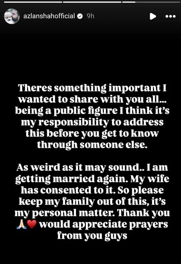 پوسٹ میں ازلان نے کہا، ‘میں دوبارہ شادی کر رہا ہوں؛ میری بیوی نے اس پر رضامندی دی ہے۔ براہ کرم میرے خاندان کو اس معاملے سے دور رکھیں، یہ ایک ذاتی بات ہے۔ شکریہ، آپ کی دعاؤں کا مشتاق ہوں۔’