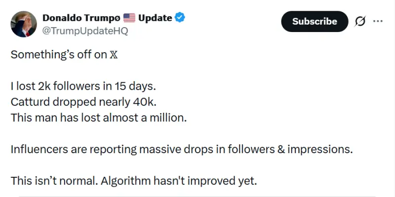 ڈونلڈ ٹرمپ اپڈیٹ کے نام سے موجود ایک اکاؤنٹ نے بھی کچھ اسی طرز کا اعتراض کرتے ہوئے لکھا ہے کہ ’کچھ تو گڑ بڑ ہے، میں 15 روز میں دو ہزار فالوورز سے محروم ہوچکا ہوں‘۔