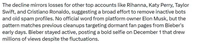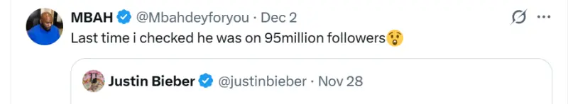 جسٹن بیبر کے ایک فین نے ان کے بھی فالوورز کی کمی کا تذکرہ کرتے ہوئے لکھا کہ ’آخری دفعہ جب میں نے دیکھا تھا تو انکے فالوورز کی تعداد 95 ملین تھی‘۔