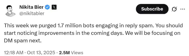 ایکس کے ہیڈ آف پروڈکٹ نیکیتا بیر نے اعلان کیا تھا کہ ’ایکس نے 1.7 ملین خودکار اکاؤنٹس کو ریپلائی تھریڈز سے ہٹایا ہے‘۔