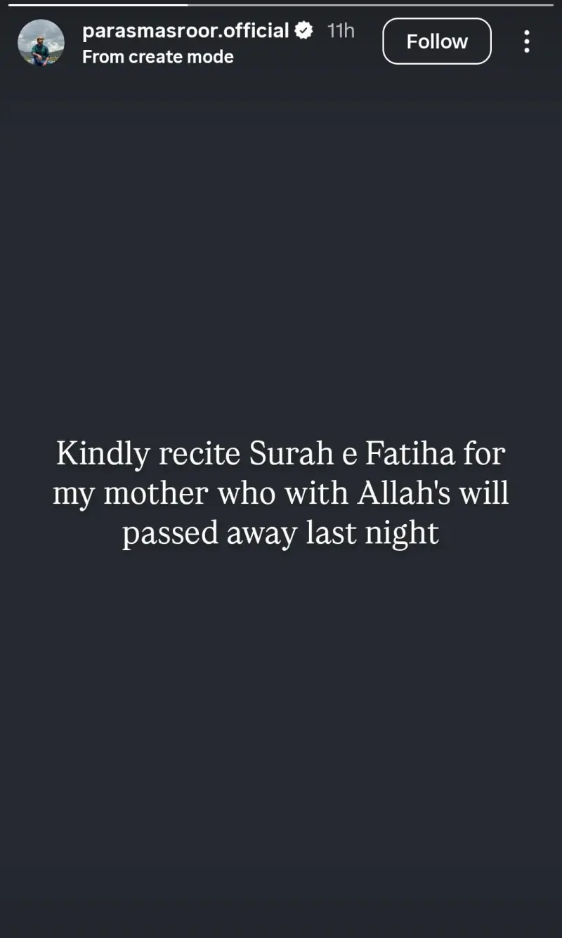 پارس مسرور نے اپنے مداحوں سے درخواست کی ہے کہ وہ ان کی والدہ کی مغفرت کے لیے دعا گو ہوں۔ پارس نے اپنی والدہ کے انتقال پر گہرے دکھ کا اظہار کرتے ہوئے کہا کہ وہ ہمیشہ ان کی رہنمائی اور محبت کو یاد رکھیں گے۔
